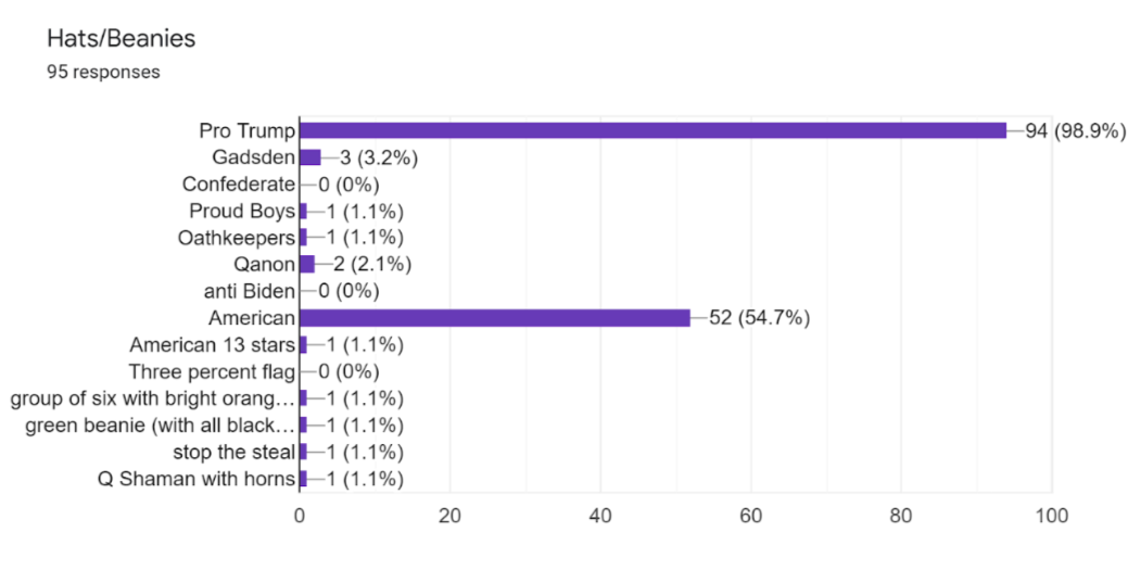 The weather on January 6, 2021, in Washington, D.C was in the low 40s Fahrenheit between the hours of 12 PM and 6 PM. The weather likely influenced the prevalence of beanies, hats, and coats. The great majority of beanies and Make America Great Again (MAGA) hats appeared identical; perhaps many were bought at concession stands at the rally before the march to the Capitol. Overcoats covered many people’s shirts, leading to difficulty in seeing t-shirts for analysis. Patches and pins were also hard to see for the same reason in addition to the relatively unsophisticated software and computer used for this analysis. It was difficult to focus and zoom in on items as small as patches and pins, particularly given the crowd sizes in some of the video clips. Overall, as the figures below demonstrate, most imagery present on January 6, 2021, at the US Capitol was pro Trump and American flag related. This finding is reflective of the known agendas of the far right groups at the Capitol that day. While there was scant far right imagery, there was a lot of nondescript, camouflage and tactical gear. These were not categories analyzed in the study; however, they were noticeable, along with the lack of far right imagery that had been prevalent at other “Stop the Steal” related events leading up to the events at the Capitol on Jan. 6. It is also known from law enforcement arrests (Kunzelman & Durkin Richer, 2021) that far right actors both planned and executed attacks that day.